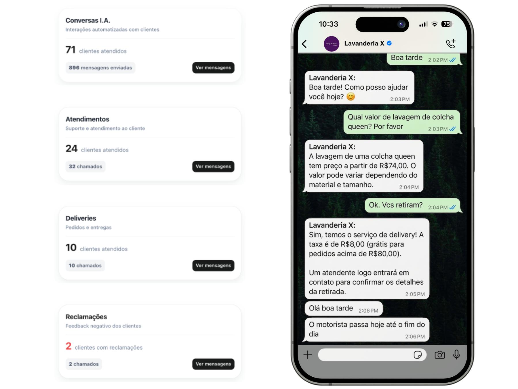Chega de responder manualmente as mesmas perguntas. A I.A. assume as conversas e resolve — você só recebe o resumo do que importa.