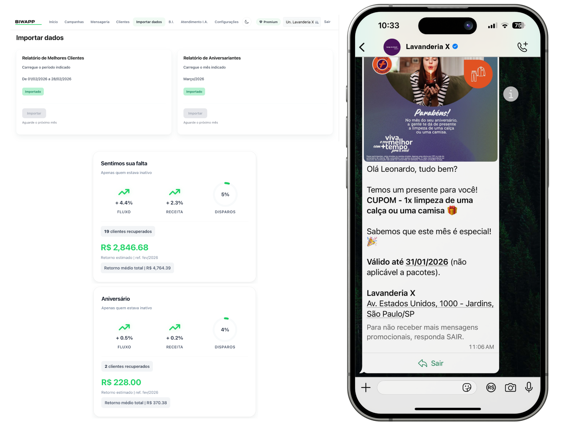 atendimento e vendas. Recuperamos clientes inativos com campanhas automatizadas, oferecemos um
